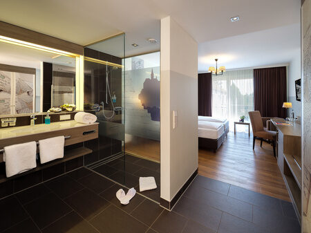Das elegante Vinylparkett sorgt für ein warmes, wohnliches Ambiente, während das offene Badkonzept mit modernen Armaturen ein Gefühl von Designbewusstsein vermittelt. Zur technischen Ausstattung gehören ein Flat-Screen-TV, ein Zimmersafe und eine Nespresso-Kaffeemaschine für Ihren individuellen Kaffeegenuss.