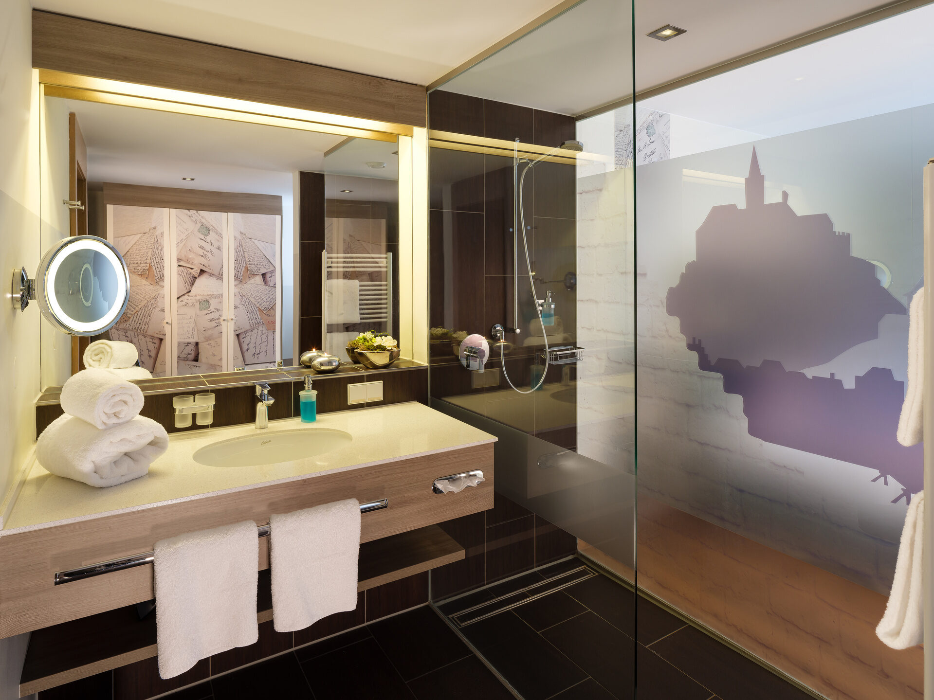 The elegant vinyl parquet flooring creates a warm, cozy atmosphere, while the open-plan bathroom with modern fittings conveys a sense of design consciousness. Technical amenities include a flat-screen TV, a room safe, and a Nespresso coffee machine for your individual coffee enjoyment.